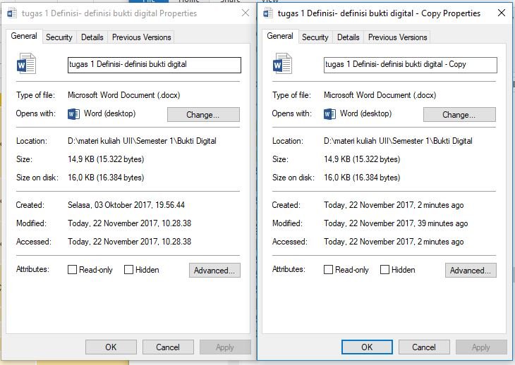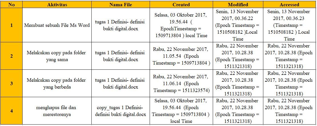 Dari hasil Uji coba diatas, terdapat beberap aktifitas yang merubah tipestamp, salah satunya adalah proses penggcopyan file, dan perubahan isi file.