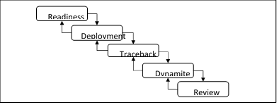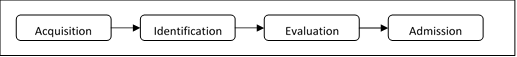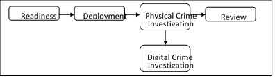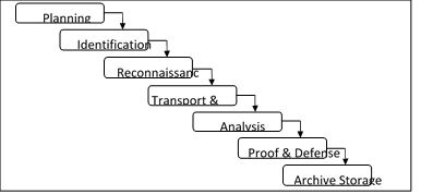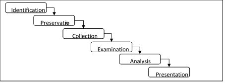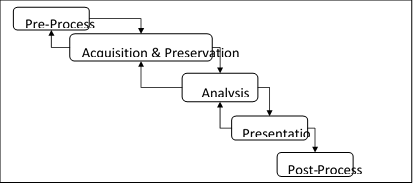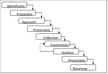 Pada tahap Akuisisi, bukti diakuisisi pada cara yang dapat diterima dengan persetujuan yang tepat dari otoritas. Hal ini diikuti oleh fase Identifikasi dimana tugas untuk mengidentifikasi komponen digital dari bukti yang diperoleh dan mengubahnya menjadi format dipahami oleh manusia. Tahap Evaluasi terdiri dari tugas untuk menentukan apakah komponen diidentifikasi dalam tahap sebelumnya, memang relevan dengan kasus yang sedang diselidiki dan dapat dianggap sebagai bukti yang sah. Pada tahap akhir, Penerimaan, bukti yang diperoleh & diekstrak disajikan dalam pengadilan hukum.